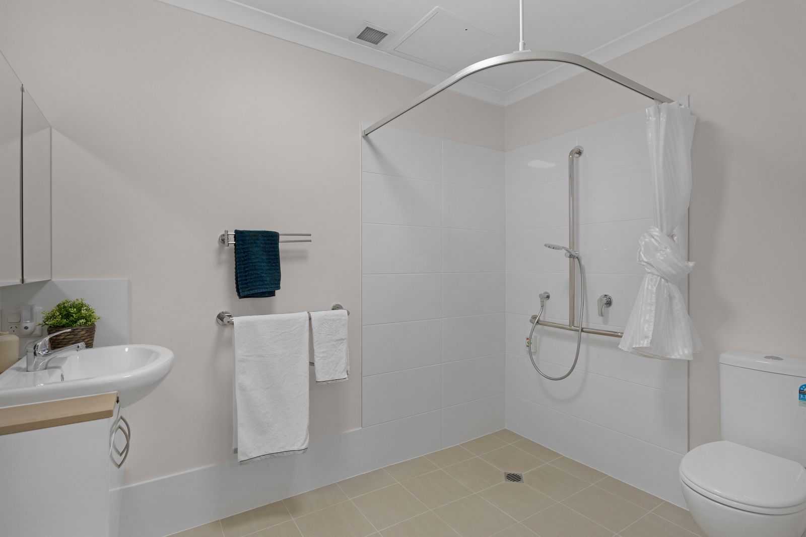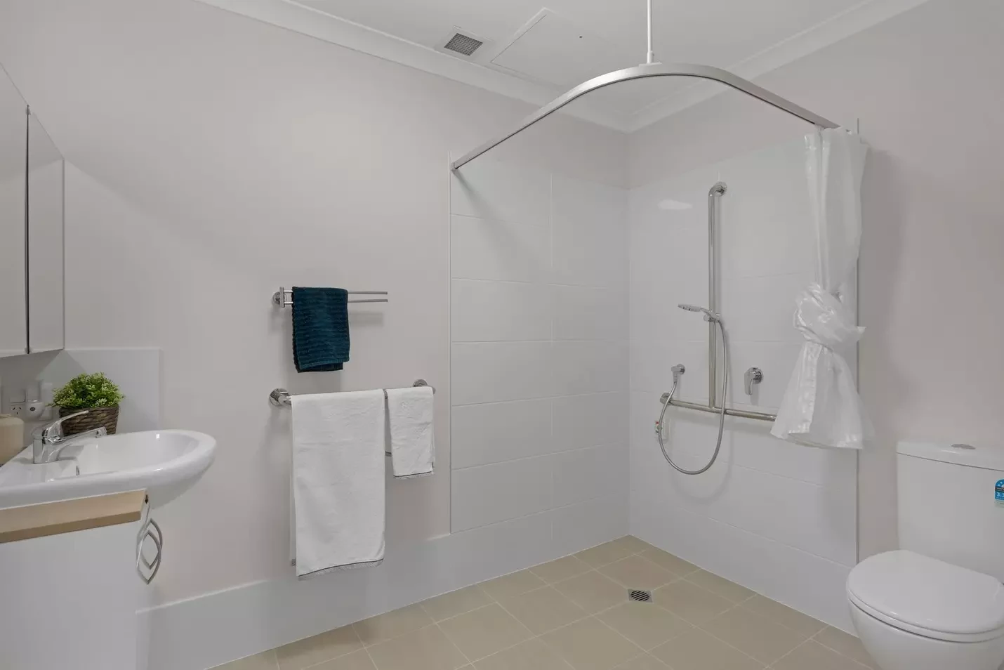 - Combined bathroom/laundry with open style shower