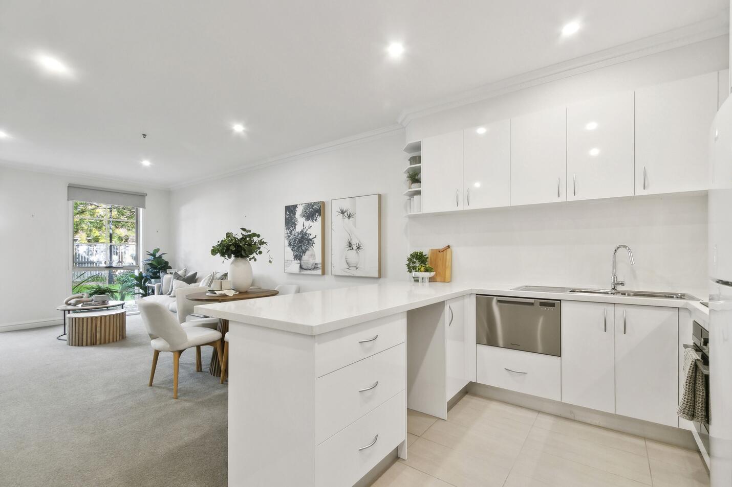 Apartment 207 is a spacious one-bedroom apartment conveniently located on the first floor with the new library, gym and wellness center just a short stroll away. This quaint apartment has premium features including stone benchtops, a well-equipped kitchen, and a large bathroom with Euro laundry.